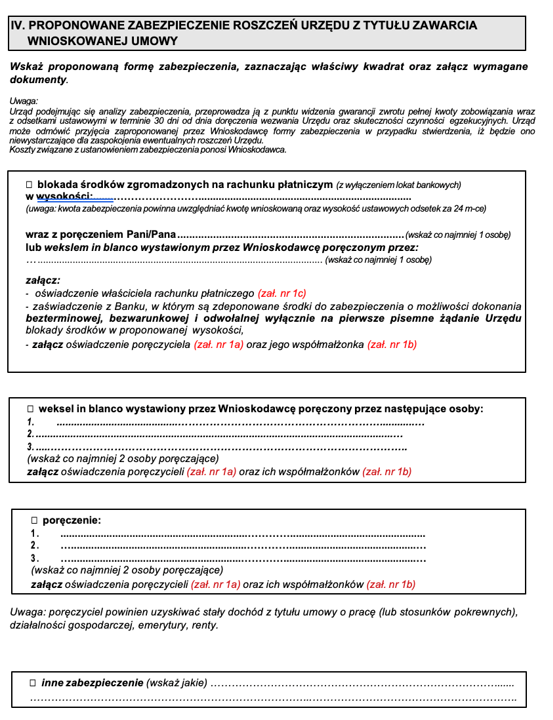 Przy zabezpieczeniu w formie weksla in blanco wnioskodawca składa pusty weksel oraz deklarację wekslową w dniu zawarcia umowy i podpisuje je osobiście w siedzibie Urzędu w obecności pracownika Urzędu. Obowiązują druki Urzędu.